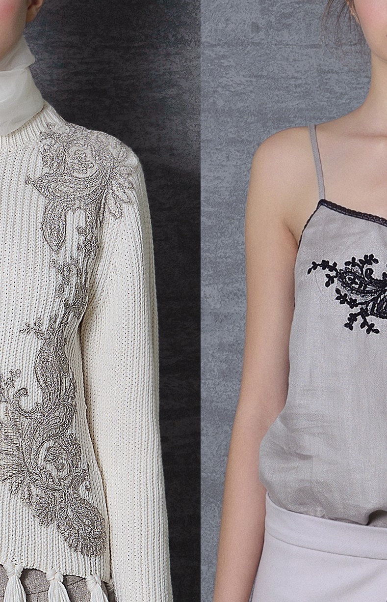 与此同时,设计师也毫不掩饰自己对东方元素的喜爱,在部分款式中用上了花瓣刺绣的图样,在单调的色彩中添上了一抹别致的韵味。